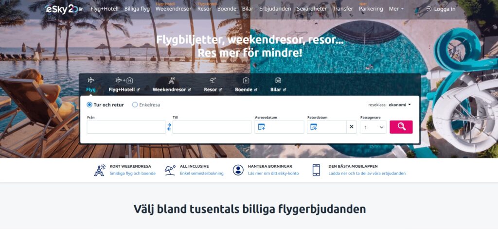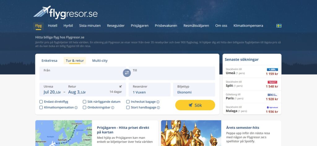 Flygresor är en av de mest betrodda och populära plattformarna för att jämföra flygpriser i Sverige. Med ett användarvänligt gränssnitt och omfattande sökfunktioner, hjälper Flygresor dig att hitta de billigaste flygbiljetterna snabbt och enkelt. Plattformen jämför priser från hundratals flygbolag och resebyråer, vilket säkerställer att du alltid får det bästa möjliga erbjudandet. Flygresor strävar efter att göra din reseupplevelse så smidig som möjligt genom att erbjuda enkel bokning och pålitlig kundservice. Oavsett om du planerar en affärsresa eller en semester, är Flygresor den perfekta platsen att börja din sökning på.