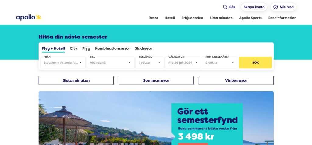 Apollo är en av Sveriges ledande researrangörer som erbjuder ett brett utbud av semesterresor till populära destinationer världen över. Med över 30 års erfarenhet i branschen, har Apollo byggt upp ett starkt rykte för att leverera högkvalitativa reseupplevelser. Apollo erbjuder allt från sol- och badresor till kryssningar och äventyrsresor, vilket gör det enkelt för alla att hitta sin drömresa. Genom att samarbeta med pålitliga flygbolag och hotell, garanterar Apollo att deras kunder alltid får den bästa servicen och de mest konkurrenskraftiga priserna.