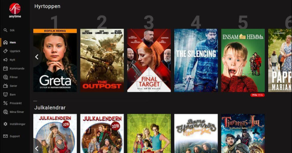 SF Anytime är en svensk streamingtjänst som erbjuder möjligheten att hyra eller köpa de senaste filmerna och klassiker. Tjänsten är tillgänglig på en mängd olika enheter, vilket gör det enkelt för användare att titta på sina favoriter när som helst och var som helst. SF Anytime erbjuder ett brett urval av genrer, från action och drama till komedi och dokumentärer. Med sin pay-per-view-modell kan användare välja att betala bara för det innehåll de vill titta på, utan några abonnemangsavgifter. SF Anytime är känt för sin höga bild- och ljudkvalitet samt sitt stora urval av nordiska filmer.
